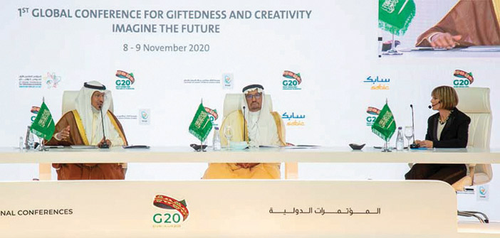 ثم بدأت الجلسة الافتتاحية الرئيسية بعنوان «تخيل المستقبل.. تمكين القدرات الشابة الموهوبة والمبدعة لتشكيل آفاق مستقبلية جديدة « بمشاركة صاحب السمو الملكي الأمير عبد العزيز بن سلمان بن عبد العزيز وزير الطاقة، ومعالي الدكتور حمد بن محمد آل الشيخ وزير التعليم، والمدير التنفيذي لليونيسيف هنريتا فور، وتناولت كيفية بناء جيل مبدع وتمكين الموهوبين من المهارات المستقبلية والوظائف. وقال سمو وزير الطاقة « إنه برؤية المملكة 2030 تم تجاوز مرحلة التخيل إلى مرحلة التنفيذ، مضيفا أنه من الأفضل تدريب الجيل الشاب ليكون في مقدمة المستقبل وأنه لا يمكن الا أن نكون على قدر من التواضع عند مقارنة انفسنا بهم وبما يمتلكونه الآن من معارف. وأضاف أن من المهم أن يكون الدور الأبرز هو تمكين الموهوبين، مشيرا إلى تدشين العديد من البرامج في الجامعات السعودية وفي جامعة الملك فهد للبترول والمعادن لتمكين الشباب الموهوب لتحقيق مستهدفات رؤية 2030 ، وأن التعليم سيكون مقاربة للتعليم المنفتح حيث يكون التفكير أكثر من الحفظ والتلقين، مع التطلع لمشاركة الطلبة في الأبحاث وإيجاد حلول لمشكلات الطاقة مثلا التي تواجه العديد من التحديات، مؤكدا سموه أن التصنيع هو الآخر أمر يشكل تحديا يتطلب توعا من التكنولوجيا ،وهذا لا يمكن فعله دون دعم ودون مواهب. وأوضح الأمير عبد العزيز بن سلمان أنه لا يكفي وضع المناهج وإنما تدريب الطلاب والموهوبين على التفكير وان يكونوا جزءا من الحل، وأن يكون النساء جزءا من عملية التدريب باعتبار المرأة نصف المجتمع، مشيرا الى أن الفكرة الأساسية تتمحور حول الوعي بالقدرات السعودية والمساواة بين الذكور والإناث وتمكين الأجيال القادمة لبناء الروبوتات واستخدام ذكائهم والذكاء الاصطناعي والامن السيبراني والتركيز على التفكير والاتمتة وغيرها.