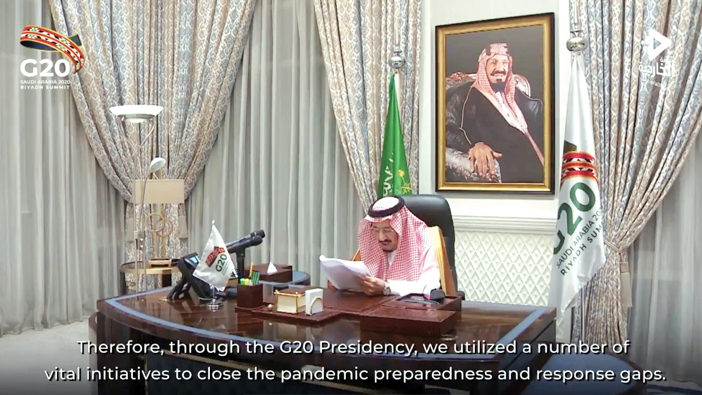 ويعكس تركيز الملك سلمان على أهمية التعاون الدولي والعمل المشترك، يعكس وجهة النظر والطريقة التي اتبعتها السعودية في إدارة ملف جائحة كورونا خلال عام رئاستها مجموعة العشرين حيث تُعّول المملكة بشكل كبير على العمل الجماعي لتحقيق هدف رئاستها لمجموعة العشرين المتمثل بحماية الأرواح وسبل العيش وتشكيل عالم أفضل لاغتنام فرص القرن الـ21 للجميع.