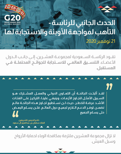 وجاءت كلمة خادم الحرمين الشريفين الملك سلمان بن عبدالعزيز -حفظه الله- تأكيدا لأهمية موضوع التأهب والتصدي للأوبئة أفردت قمة الرياض فعالية خاصة بهذا الموضوع لاعتبار أن جائحة كورونا مثّلت تحديًا صحيًا عالميًا غير مسبوق على الأفراد والمجتمع والاقتصاد.