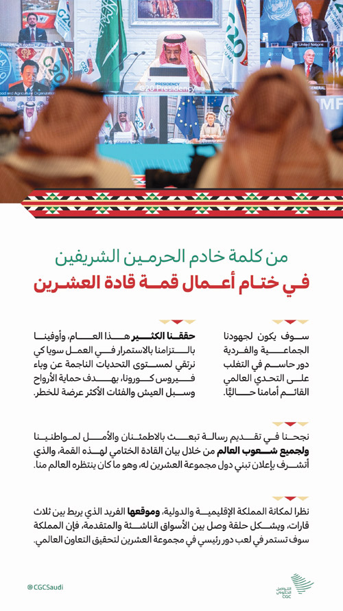 والآن أدعو دولة رئيس الوزراء الإيطالي جوسيبي كونتي لتقديم كلمته واستلام رئاسة إيطاليا لمجموعة العشرين. تفضل دولة رئيس الوزراء. بعد ذلك أعلن خادم الحرمين الشريفين -رعاه الله- اختتام قمة الرياض لمجموعة العشرين. وقال -حفظه الله-: «شكراً لك دولة رئيس الوزراء. مع خالص تمنياتنا أن تحظى رئاستكم لمجموعة العشرين بالنجاح والتوفيق. وأتقدم بالشكر الجزيل لجميع المشاركين في هذه القمة فقد كان للمملكة العربية السعودية الشرف في تولي رئاسة مجموعة العشرين خلال هذا العام الاستثنائي في تاريخ البشرية. والسلام عليكم ورحمة الله وبركاته. أعلن الآن عن اختتام قمة الرياض لمجموعة العشرين. وضم وفد المملكة المشارك في اجتماع القمة صاحب السمو الملكي الأمير محمد بن سلمان بن عبدالعزيز ولي العهد نائب رئيس مجلس الوزراء وزير الدفاع، وصاحب السمو الأمير فيصل بن فرحان بن عبدالله وزير الخارجية، ومعالي وزير الدولة عضو مجلس الوزراء الدكتور مساعد بن محمد العيبان، ومعالي وزير الدولة عضو مجلس الوزراء الدكتور إبراهيم بن عبدالعزيز العساف، ومعالي وزير المالية الأستاذ محمد بن عبدالله الجدعان.