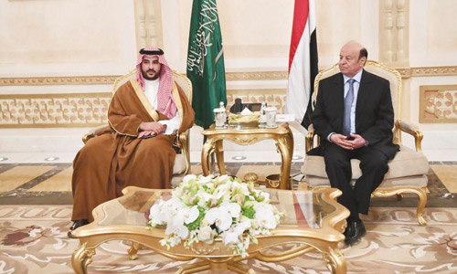 استقبل فخامة الرئيس عبدربه منصور هادي رئيس الجمهورية اليمنية، بمقر إقامته مساء أمس الأول، صاحب السمو الملكي الأمير خالد بن سلمان بن عبدالعزيز نائب وزير الدفاع. وجرى خلال اللقاء بحث مستجدات الأوضاع في اليمن وخطوات تنفيذ اتفاق الرياض، وجهود المبعوث الأممي لليمن مارتن غريفث للتوصل إلى حل سياسي شامل وفق المرجعيات الثلاث، وجهود التحالف السياسية والعسكرية والأمنية والإغاثية والتنموية لليمن لاستعادة مؤسساته وأمنه واستقراره.
