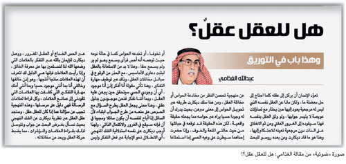 ثمة عديد من الأسئلة التي جالت في ذهني وأنا أقرأ «توريقة» أستاذنا الغذامي «هل للعقل عقل؟» ولا أدري لماذا قفز ابن عربي وجدلية الحس والعقل إلى ذهني حينها.