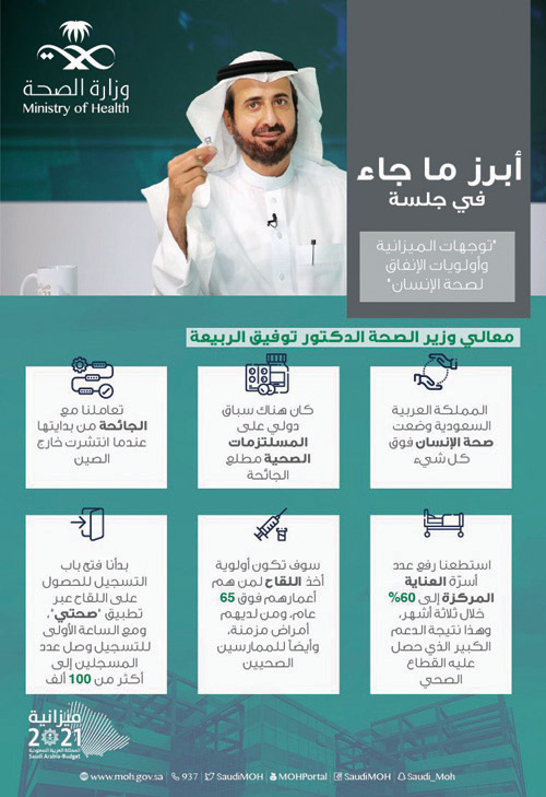 وأهابت «الصحة» بالجميع سرعة التسجيل حفاظاً على صحتهم وسلامتهم وحمايةً لهم - بإذن الله - من الإصابة بفيروس كورونا المستجد كوفيد - 19.