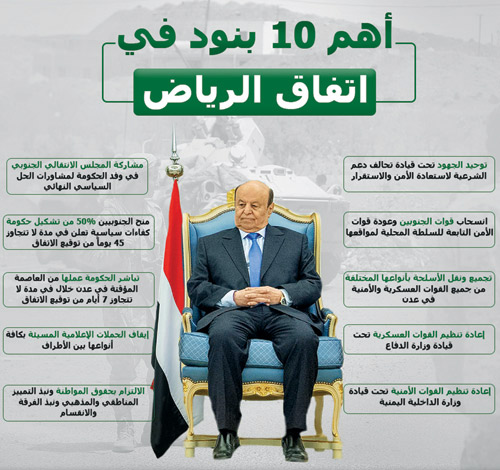 وأشادت دولة الإمارات العربية المتحدة بتنفيذ اتفاق الرياض بين الحكومة اليمنية الشرعية، والمجلس الانتقالي الجنوبي، وبما جرى الإعلان عنه من تشكيل حكومة كفاءات سياسية في اليمن، معربة عن أملها في أن تكون هذه خطوة على طريق تحقيق حل سياسي وتسريع الدفع بمسارات إنهاء الأزمة اليمنية.