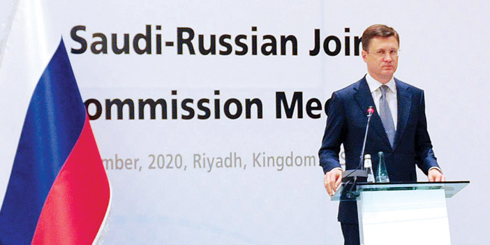 وكان قد عقد الرئيسان المشاركان في اللجنة الحكومية المشتركة السعودية - الروسية للتعاون التجاري والاقتصادي والعلمي والتقني؛ صاحب السمو الملكي الأمير عبد العزيز بن سلمان بن عبد العزيز وزير الطاقة، ومعالي نائب رئيس مجلس الوزراء في الاتحاد الروسي ألكسندر نوفاك أمس اجتماعاً في الرياض، وتبادل الرئيسان المشاركان خلال الاجتماع وجهات النظر حول التعاون السعودي - الروسي في مختلف المجالات، وأكدا أهمية دور اللجنة كعنصرٍ فاعلٍ في الارتقاء بالعلاقات الثنائية بين البلدين. ورحبا بنتائج زيارة فخامة الرئيس فلاديمير بوتين؛ رئيس روسيا الاتحادية، إلى الرياض، والمباحثات التي أجراها مع خادم الحرمين الشريفين؛ الملك سلمان بن عبد العزيز آل سعود، في أكتوبر 2019م. واستعرض الرئيسان المشاركان التقدم الجاري خلال الدورة السادسة الحالية للجنة، التي استضافتها موسكو في 20 يونيو 2019م، وناقشا التحضير للدورة السابعة للجنة. واتفق الرئيسان المشاركان على النقاط التالية : التأكيد على أهمية الإطار الاستراتيجي السعودي - الروسي رفيع المستوى، الذي تم التوقيع عليه في 14 أكتوبر 2019م، في الرياض، للمواءمة بين الاستراتيجيات الوطنية للبلدين، ومواصلة العمل على توسيع التعاون التجاري والاقتصادي والصناعي والاستثماري بين البلدين في إطار صيغ التعاون الثنائي، والتأكيد على التزام البلدين بميثاق التعاون بين الدول المنتجة للبترول، الذي وقّعه صاحب السمو الملكي وزير الطاقة السعودي ومعالي وزير الطاقة الروسي، بحضور قيادتي البلدين، في 14 أكتوبر 2019م، لأنه يوفّر منصةً متميزةٍ للحوار والتعاون بين الدول المنتجة للبترول، على المستوى الوزاري والتقني، لما فيه صالح الدول المنتجة والمستهلكة للبترول، وكذلك الاقتصاد العالمي، وإعادة تأكيد التزام البلدين بإعلان التعاون بين منظمة أوبك والدول المنتجة غير الأعضاء في المنظمة، الموقع في 12 إبريل 2020م، والمُعدل في يونيو وسبتمبر ونوفمبر، كآلية مهمةٍ جداً لدعم استقرار أسواق البترول العالمية، والتنويه، كرئيسين مشاركين لاتفاق أوبك بلس، ورئيسين مشاركين للجنة الوزارية المشتركة لمراقبة الإنتاج، بفاعلية التعاون الثنائي الاستباقي بين البلدين، وكذلك تعاونهما الثنائي، والتعاون المتعدد الأطراف مع البلدان المشاركة الأخرى، في تعزيز استقرار أسواق البترول العالمية، خلال جائحة كوفيد19.، والتأكيد على أهمية التزاملدول المشاركة بالاتفاق، وخفضها إنتاجها، وتعويضها عن الكميات الزائدة الإنتاج، حسب مقتضى الاتفاق، وأهمية الاستمرار في مراقبة السوق، عن كثب، والعمل، بشكل استباقي، مع تعديل حجم الإمدادات تدريجياً، ووفقًا لمتطلبات السوق، لتسريع عودة التوازن إليها، وتعزيز التعاون الثنائي، في مجال الطاقة، بين الجهات ذات العلاقة في مجالات الزيت والغاز، والكهرباء، وكفاءة الطاقة، والطاقة البديلة، وتقديم الدعم للتغلب على أي تحديات تواجه هذا التعاون، كذلك التأكيد على أهمية تنفيذ البيان المشترك بشأن الطاقة والمناخ، الذي تم التوقيع عليه في عام 2018م، والتنسيق بشأن القضايا والمبادرات المتعلقة بتغير المناخ، بما في ذلك الاقتصاد الدائري للكربون، وتقنيات الطاقة النظيفة، التي تركز على الانبعاثات، ووقود الطيران الأقل كربوناً (المُستخلص من الزيت) في منظمة الطيران المدني الدولي (ICAO)، إضافة إلى تعزيز التعاون الثنائي في مجالات الصناعة، والفضاء، وتقنيات المعلومات والاتصالات، والتنمية الحضرية، والتمويل والمصارف، والنقل، والتعليم والثقافة، والقطاعات الأخرى ذات الاهتمام المشترك بين البلدين، وذلك من خلال تنفيذ المشروعات، وتبادل المعرفة، أو أي نوع آخر من التعاون يتفق عليه الطرفان، وتسهيل الاستثمارات الثنائية، في المشروعات المشتركة، التي تشمل مجموعة واسعة من الصناعات، والإنتاج المشترك للمنتجات فائقة التقنية، وغيرها من المجالات ذات الاهتمام المشترك.