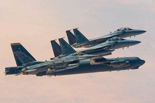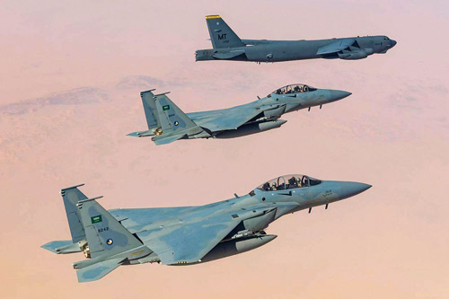 أتمت القوات الجوية الملكية السعودية والقوات الجوية الأمريكية أمس تمريناً ثنائياً، شاركت فيه مقاتلات (ف - 15 إس آي) السعودية، والقاذفات الإستراتيجية (بي - 52) ومقاتلات (ف - 16) التابعة للقوات الجوية الأمريكية.