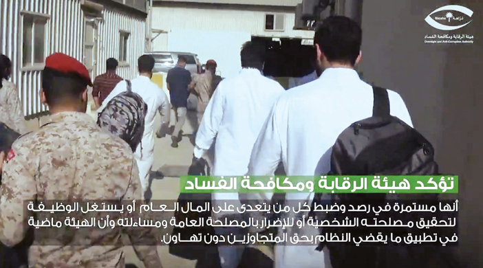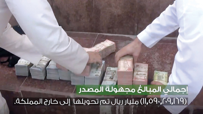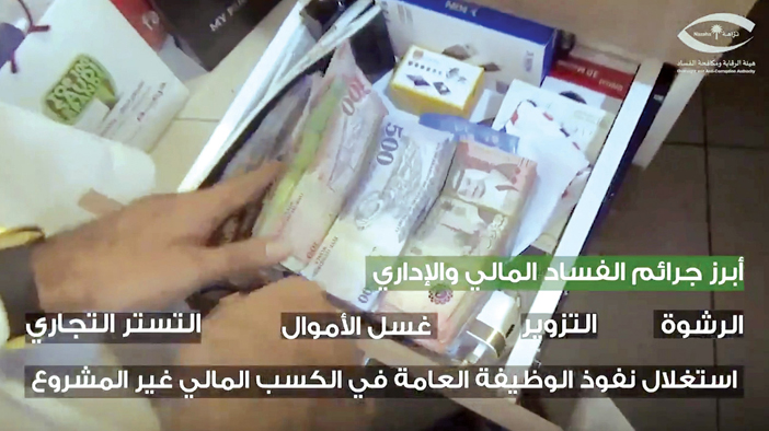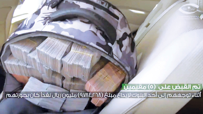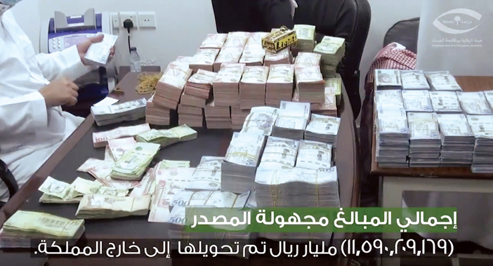 صرّح مصدر مسؤول في هيئة الرقابة ومكافحة الفساد بأن الهيئة باشرت بالتعاون مع البنك المركزي السعودي إجراءاتها حيال المعلومات المتوفرة لديها عن تورط عدد من موظفي البنوك في تلقي رشا من تشكيل عصابي، مكون من مجموعة مقيمين ورجال أعمال، مقابل إيداع مبالغ نقدية مجهولة المصدر، وتحويلها إلى خارج المملكة، وبإجراء التحريات الميدانية وتحليل الحسابات البنكية للكيانات التجارية وربطها بالواردات الجمركية، اتضح أن المبالغ النقدية مجهولة المصدر المودعة بحسابات تلك الكيانات التجارية بلغت (11,590,209,169) أحد عشر ملياراً وخمسمائة وتسعين مليوناً ومئتين وتسعة آلاف ومائة وتسعة وستين ريالاً حُولت إلى خارج المملكة، وعليه فقد قُبض على (5) مقيمين أثناء توجههم لأحد البنوك لإيداع مبلغ (9.784.268) تسعة ملايين وسبعمائة وأربعة وثمانين ألفاً ومئتين وثمانية وستين ريالاً نقداً كان بحوزتهم. كما قُبض على (7) رجال أعمال، و(12) موظف بنك، وضابط صف بشرطة إحدى المناطق، و(5) مواطنين، و(2) مقيمين، لتورطهم في جرائم الرشوة، والتزوير، واستغلال نفوذهم الوظيفي في الكسب المالي غير المشروع، والتستر التجاري، وغسل الأموال، وذلك على النحو الآتي: