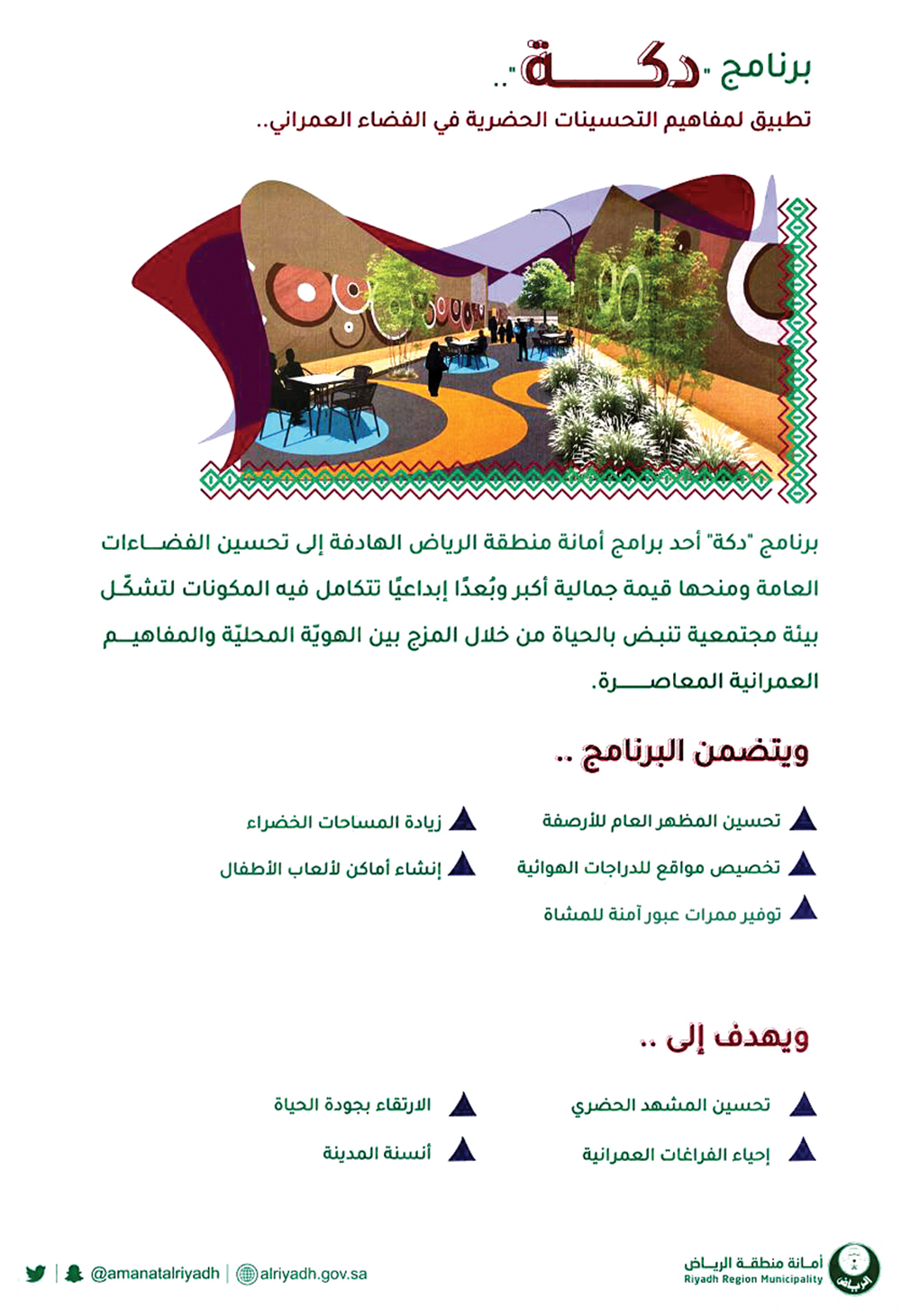 أطلقت أمانة منطقة الرياض برنامج «دكة»، الذي يُعد إحدى مبادراتها في مجال العمران التكتيكي، وتطبيقًا لمفاهيم التحسينات الحضرية في الفضاء العمراني، بهدف تحسين الفضاءات العامة، ومنحها قيمة جمالية وبُعدًا إبداعيًا تتكامل فيه المكونات لتشكّل بيئة مجتمعية تنبض بالحياة. وسيسهم البرنامج في الارتقاء بجودة الحياة داخل مدينة الرياض، إضافة إلى دوره في تحسين المشهد الحضري، وأنسنة المدينة من خلال زيادة المساحات الخضراء، وتخصيص مواقع للدراجات الهوائية، وإنشاء أماكن لألعاب الأطفال، وتوفير ممرات عبور آمنة للمشاة. ويأتي اختيار مسمى «دكة» انطلاقًا مما تمثله من مبادئ وقيم نابعة من الحياة الاجتماعية والثقافية والبيئة الطبيعية للمجتمع، والمتماشية مع المفهوم العالمي للتحسينات الحضرية، إلى جانب كونها أحد عناصر النسيج العمراني التقليدي في العديد من مدن المملكة. وتعمل الأمانة على تهيئة البيئة اللازمة لدعم واستحداث خيارات جديدة تعزز مشاركة السكان في الأنشطة الثقافية والترفيهية والرياضية التي تسهم في تعزيز جودة حياة الفرد والأسرة، والارتقاء بمستوى الخدمات المقدمة للسكّان، تماشيًا مع مستهدفات القطاع البلدي في ضوء رؤية المملكة 2030. ويتكامل البرنامج مع العديد من البرامج والمبادرات التي أطلقتها أمانة منطقة الرياض لإحياء الفراغات العامة في المدينة، وتوفير بيئة مجتمعية حيوية تضمن التشارك الإيجابي والتفاعل الآمن مع المكونات العمرانية كافة.