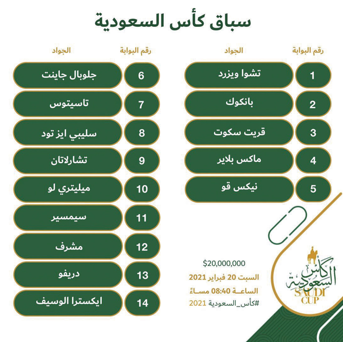 يسعى 14 جواداً من شتى أنحاء العالم وبألقاب فئوية إلى تسجيل بصمتهم على صفحات تاريخ الفروسية في السباق الأعلى والأغلى في العالم البالغة جائزته 10 ملايين دولار أمريكي على مسافة 1800م . ويشفع لها تاريخها المرصع بالذهب والانتصارات في السباقات العالمية ليس أقل من « البريدرز كب « والديربي الإنجليزي والفرنسي والياباني وكذلك البيقاسوس. ويأمل الجواد الأمريكي «نيكس قو» والمرشح «الفافوري» لوضع بصمته على خيول العالم وإحكام قبضته العالمية في سباقات السرعة ويعزز انتصاره المتوقع بتوهج مدربه الأمريكي براد كوكس بعد فوزه مؤخرا بمدرب أمريكا الأول في2020م عقب انتصاره مع نيكس قو بسباق البريدرز كب مايل والبيقاسوس.