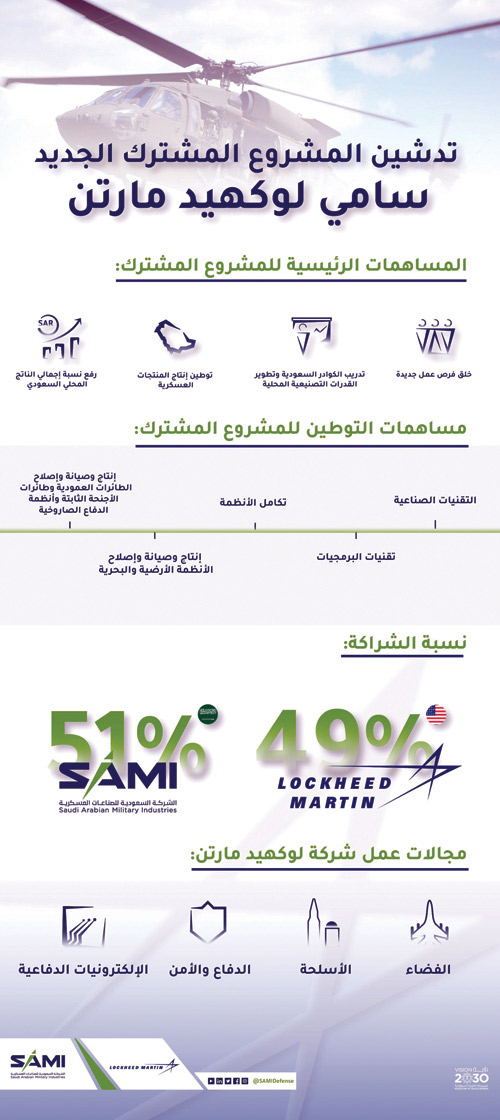 أعلنت الشركة السعودية للصناعات العسكرية SAMI المملوكة بالكامل لصندوق الاستثمارات العامة، وشركة «لوكهيد مارتن» الأمريكية أمس توقيع اتفاقية إستراتيجية لتأسيس مشروع مشترك للتعاون بين الشركتين في مجال تعزيز القدرات الدفاعية والأمنية للمملكة العربية السعودية ودعم قدراتها التصنيعية، والإسهام في تحقيق أهداف التنمية الاقتصادية ضمن رؤية المملكة 2030. وجرى إبرام الاتفاقية على هامش معرض ومؤتمر الدفاع الدولي (أيدكس) في مدينة أبوظبي بدولة الإمارات العربية المتحدة، ووقعها الرئيس التنفيذي للشركة السعودية للصناعات العسكرية SAMI المهندس وليد أبوخالد، ونائب الرئيس الأول في شركة «لوكهيد مارتن للقطاع الدولي» تيموثي كاهيل. وبموجب الاتفاقية ستمتلك شركة SAMI 51% من أسهم المشروع المشترك مقابل 49% لشركة «لوكهيد مارتن»، بينما ستعمل الاتفاقية الجديدة على تطوير قدرات التوطين من خلال نقل التقنية والمعرفة، وتدريب الكوادر السعودية على تصنيع المنتجات وتقديم الخدمات لصالح القوات المسلحة السعودية. وقال الرئيس التنفيذي للشركة السعودية للصناعات العسكرية SAMI المهندس وليد أبوخالد: «مواكبةً لأهداف رؤية المملكة 2030 نقوم في شركة SAMI باستكشاف مجالات التعاون التي تساعدنا على بناء قطاع صناعات عسكرية مستدام ومكتفٍ ذاتياً في المملكة، ومن المؤكد أن شراكتنا القوية وطويلة الأمد مع لوكهيد مارتن تؤكد على التزامنا التام، إذ تشكل اتفاقية المشروع المشترك خطوة رئيسية في مسيرتنا لتحقيق أهدافنا الطموحة، ونتطلع إلى تسجيل نتائج ضخمة في المستقبل القريب، كما ستسهم هذه الشراكة في تحقيق جهود صندوق الاستثمارات العامة عبر شركة SAMI في توطين أحدث التقنيات والمعرفة، فضلاً عن بناء شراكات اقتصادية إستراتيجية». من جهته قال نائب الرئيس الأول في شركة «لوكهيد مارتن للقطاع الدولي» تيموثي كاهيل : «نضع اليوم حجر أساس مهم في علاقتنا الإستراتيجية مع الشركة السعودية للصناعات العسكرية، الذي يُعَد جزءاً من التزامنا طويل الأمد لدعم خطط المملكة في التوطين والنمو الاقتصادي، وتُعَد هذه الاتفاقية ضمن إستراتيجية لوكهيد مارتن لتوسيع شراكتنا مع المملكة العربية السعودية من خلال توفير حلول دفاعية وأمنية معتمدة من شأنها دعم الأمن والازدهار لعقود قادمة». ويهدف مشروع «سامي-لوكهيد مارتن» المشترك إلى تطوير القدرات في مجالات تقنيات التصنيع، وتقنيات البرمجات، وتكامل الأنظمة، وكذلك في إنتاج وصيانة وإصلاح الطائرات العمودية وذات الأجنحة الثابتة، وأنظمة الدفاع الصاروخية، والأنظمة على متن السفن. ويقع المقر الرئيسي للشركة العالمية المتخصصة في صناعات الأمن والفضاء «لوكهيد مارتن» في مدينة بيثيسدا بولاية ماريلاند الأمريكية، بينما لها وجود في المملكة العربية السعودية منذ العام 1965م، وذلك منذ تسليمها أول مجموعة من طائرات النقل العسكرية «سي-130» هيركوليز C-130، واستمرت الشركة منذ ذلك الحين في دعم المملكة في مجالات أنظمة الدفاع الجوية والصاروخية المتكاملة، وتقنيات الطائرات التكتيكية والعمودية، والأنظمة البحرية، وأنظمة الاتصالات عبر الأقمار الصناعية، وعززت شركة «لوكهيد مارتن» وجودها في المملكة من خلال مبادرات التدريب التي أسهمت في تشجيع وصقل مواهب الجيل القادم من الكوادر السعودية الموهوبة، مما يضمن استدامة صناعة الطيران والدفاع، ودعم تحقيق أهداف رؤية المملكة 2030.