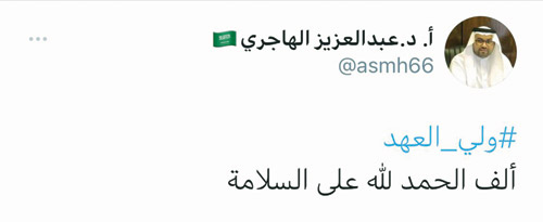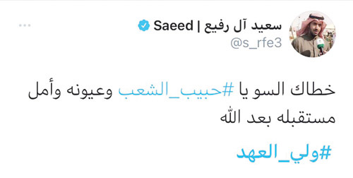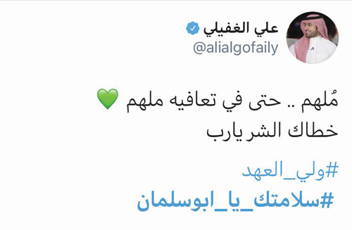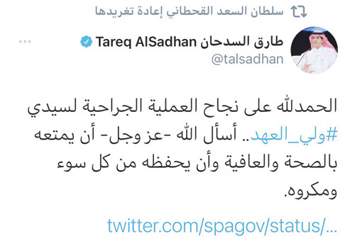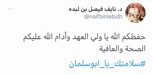 من جهته عبر المغرد سلطان القحطاني عن فرحته لسلامة ولي العهد «بسم الله عليك».