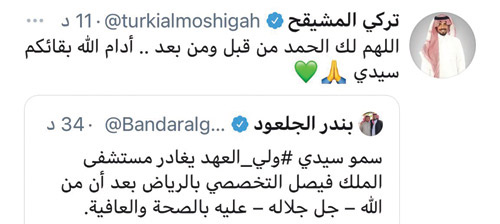 وقالت بنت الوطن في تغريدة لها «الحمدلله على سلامتك يا أبوسلمان، ماتشوف شر ياذخرنا وعزوتنا خطاك السوء الله يحفظك ويمتعك بالصحة والعافية، وياعسى تبطي سنينك يافخر الوطن» ، وقالت المواطنة حنان « لا باس طهور إن شاء الله يا أميرنا ربي يديم عليك الصحة والعافية يارب و يطول بعمرك و ينصرك على أعدائك».