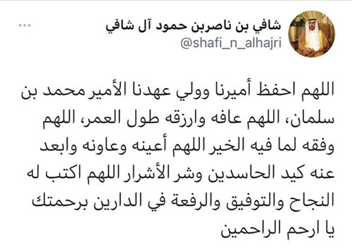 وقال الشيخ شافي بن ناصر آل شافي في تغريدة له «اللهم احفظ أميرنا وولي عهدنا الأمير محمد بن سلمان، اللهم عافه وارزقه طول العمر، اللهم وفقه لما فيه الخير اللهم أعنه وعاونه وابعد عنه كيد الحاسدين وشر الأشرار. اللهم اكتب له النجاح والتوفيق والرفعة في الدارين برحمتك يا أرحم الراحمين.