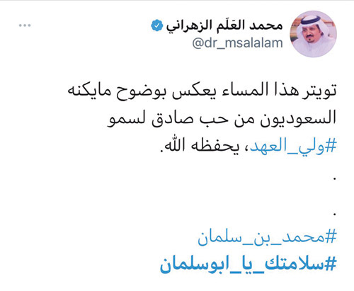 وأشار محمد الزهراني إلى أن تويتر هذا المساء يعكس بوضوح مايكنه السعوديون من حب صادق لسمو ولي العهد- يحفظه الله-.