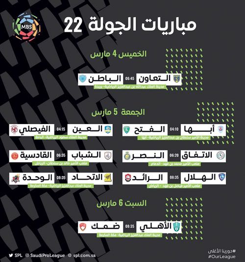تفتتح مساء اليوم الخميس عند الساعة 6.45 مواجهات الجولة الثانية والعشرين من دوري كأس الأمير محمد بن سلمان للمحترفين التي ستتواصل كذلك على مدى يومي الجمعة والسبت بسبعة لقاءات، وسيلتقي اليوم فريقا التعاون والباطن على ملعب مدينة الملك عبدالله بن عبدالعزيز الرياضية ببريدة في لقاء يشوبه الحذر بشكل كبير مع البحث عن الفوز، فالفريق التعاوني عاد بانتصار ثمين وكبير من أمام الاتفاق وبثلاثية نظيفة، رفعت رصيد الفريق إلى 31 نقطة، وقفز بها للمركز الخامس، ودخل بها منطقة الأمان واقترب من المنافسة على المركز الرابع، وسيحاول تحقيق الفوز ليؤمن وضعه أكثر، ويتفرغ للبحث عن البطاقة الآسيوية.