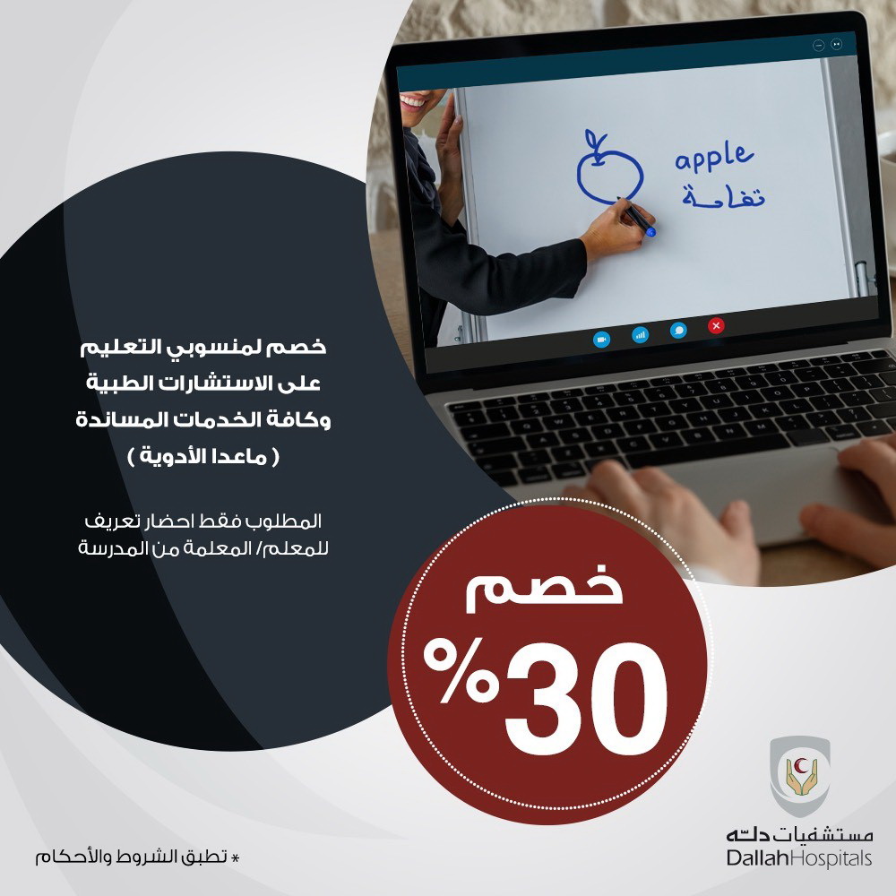 أعلنت مستشفيات دلة عن خصم بنسبة 30 في المائة لمنسوبي التعليم على الاستشارات الطبية والخدمات الطبية كافة كخدمات الأشعة والمختبر حتى نهاية العام الجاري. ويأتي هذا الإعلان انطلاقاً من حرص مستشفيات دلة على قطاع التعليم بمساريه العام والجامعي، واستمراراً للتعاون المستمر بين شركة دلة الصحية ووزارة التعليم، فضلاً عن تقديرها للجهود التي يبذلها منسوبو التعليم، وللمكانة الكبيرة للمعلم، حيث تحرص مستشفيات دلة على تقدير ذلك الدور ذي الصلة بتأسيس الأجيال على أفضل وجه، إلى جانب تعليم الشباب والباحثين عن العلم في المجالات كافة.