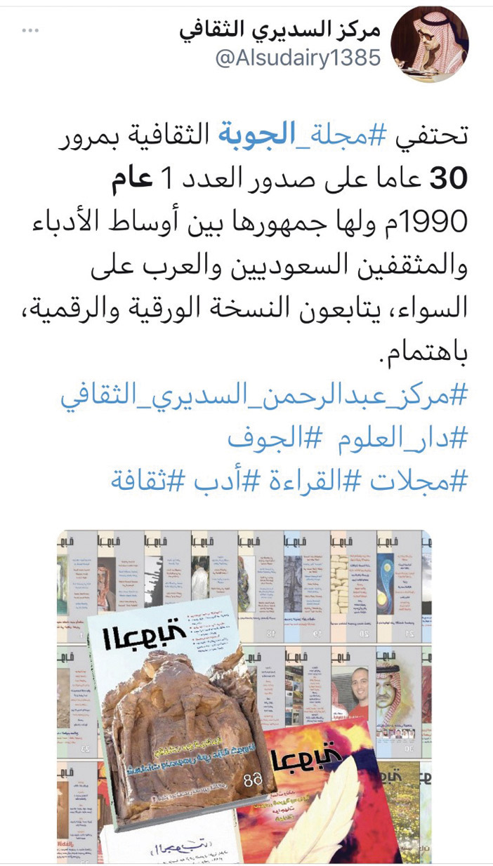1– إذ جعل من منصة «أدبي الجوف» بوصلة يحرص للتأشير عليها شمالأ المبدعين، إضافة لسعيه التنموي الحثيث فلا تكاد تجد محفلاً للحديث عن جانب تنموي.