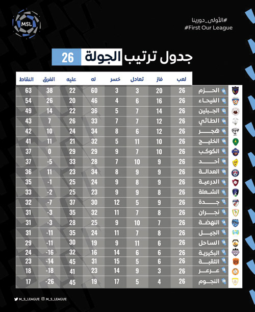 وبهذه النتيجة يصبح الكوكب في المركز السابع بـ37 نقطة، وبقي الساحل على رصيده السابق 29 نقطة بالمركز السادس عشر.