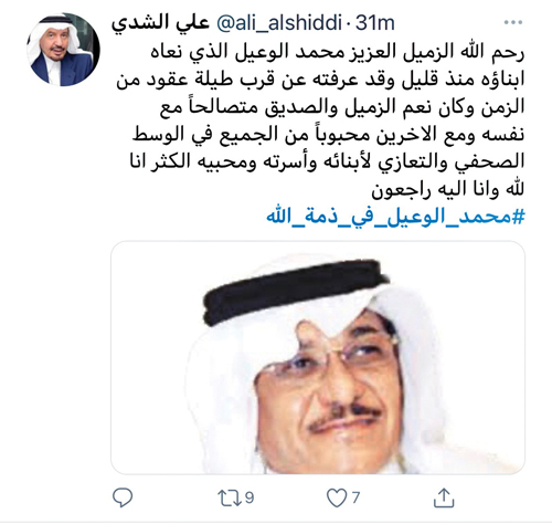 كما نعى الوسط الإعلامي والصحفي الفقيد في تغريدات عبر حساباتهم في «تويتر».