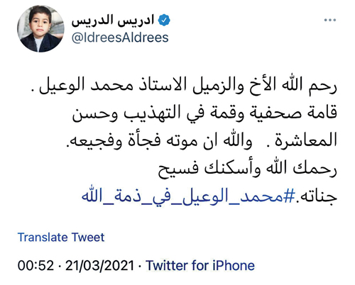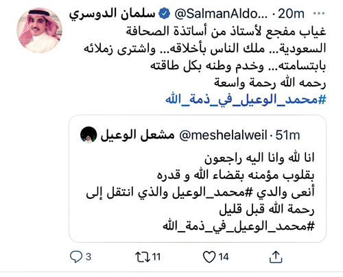 وقال نايف الوعيل نجل الفقيد في تغريدة عبر حسابه في «تويتر»: «إنا لله وإنا إليه راجعون» بقلوب مؤمنة بقضاء الله وقدره.. أنعى والدي ومعلمي وقدوتي وصديقي وجنتي محمد الوعيل الذي انتقل إلى رحمة الله قبل قليل.
