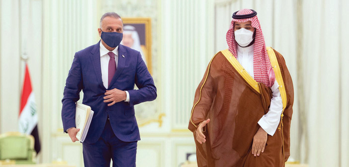 وقد تم عقد جلسة مباحثات بين صاحب السمو الملكي الأمير محمد بن سلمان بن عبد العزيز آل سعود ولي العهد نائب رئيس مجلس الوزراء وزير الدفاع ودولة السيد/ مصطفى الكاظمي رئيس مجلس الوزراء لجمهورية العراق تناولت آفاق التعاون الثنائي بين البلدين الشقيقين وسبل تعزيزها في كافة المجالات، كما تم تبادل وجهات النظر حول المسائل والقضايا التي تهم البلدين على الساحتين الإقليمية والدولية بما يسهم في دعم وتعزيز الأمن والاستقرار في المنطقة والعالم.