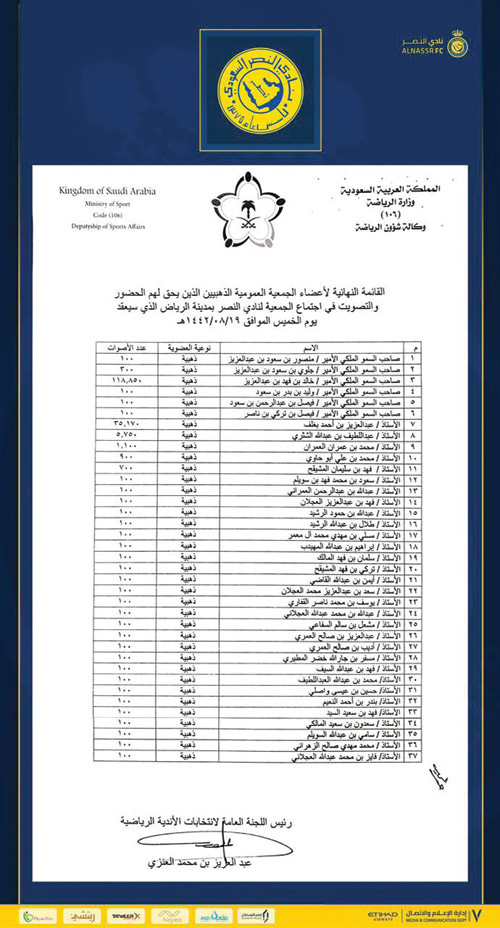 وأصدرت لجنة الانتخابات الخاصة بالأندية مساء أمس القائمة النهائية لأعضاء الجمعية العمومية بواقع 37 عضوا ذهبيا و97 عضوا عاديا.