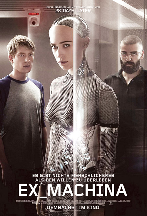 يبدأ فيلم الماكينة القديمة Ex_Machina 2015 للمخرج أليكس غارلاند بأخبار فوز الشخصية الرئيسة كاليب في مسابقة، وتبدأ الفرحة، ثم نراه في طائرة مروحية ينتقل من المدينة إلى غابة خضراء شاسعة، وتتوقف الطائرة بجانب نهر، ويكمل كاليب خطواته مشياً بجانب النهر حتى يصل إلى مبنى بلا نوافذ، وهو مركز أبحاث يهتم بالذكاء الاصطناعي واسمه مركز «الكتاب الأزرق» BlueBook – ونعرف لاحقاً أن الاسم مأخوذ من عنوان كتاب للفيلسوف لودفيغ فيتغنشتاين-.. يقف كاليب، أما المبنى ثم تُلتقط صورته من خلال كاميرا خفية موجودة بجانب الباب، وبعدها نسمع صوتاً أنثوياً رقمياً يعطيه التعليمات.