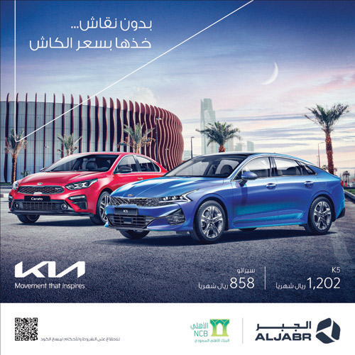 واصلت شركة الجبر التجارية وكلاء سيارات كيا موتورز في المملكة نهجها في توفير أفضل الحلول والخيارات أمام عملائها لتملّك سيارات كيا الرائعة، حيث أعلنت الشركة عن تعاونها مع البنك الأهلي السعودي لتقديم واحدة من أقوى عروضها لتملّك سياراتها من خلال عرض (بدون نقاش خذها بسعر الكاش) والذي يتضمن مزايا تمويلية غير مسبوقة؛ حيث يأتي هذا العرض بدون هامش ربح تمويلي، وبدون دفعة أولى، وبدون رسوم إدارية، ودفعة تملّك بنسبة 35 في المائة فقط مع إمكانية تقسيطها أيضاً، ويشمل العرض كافة سيارات كيا موتورز موديل 2020، بالإضافة لسيارة K5 وتيولورايد 2021.