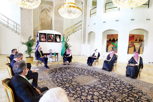 استقبل صاحب السمو الأمير فيصل بن فرحان بن عبدالله وزير الخارجية، في مكتبه بمقر الوزارة بالرياض أمس معالي وزير خارجية جمهورية اليونان نيكوس دندياس، ومعالي وزير الدفاع الوطني في جمهورية اليونان نيكولاوس بانايوتوبولوس. وفي بداية الاستقبال وقع سموه ووزير الخارجية اليوناني على اتفاقية بين البلدين الصديقين بشأن مشروع الترتيبات الخاصة بالوضع القانوني للقوات المسلحة اليونانية المشاركة في دعم القدرات الدفاعية للمملكة، وذلك بحضور معالي وزير الدفاع اليوناني. عقب ذلك عقد سموه مع الوزيرين جلسة مباحثات رسمية تناولت العلاقات الثنائية بين البلدين الصديقين، وسبل دعمها وتعزيزها بما يخدم المصالح المشتركة، إضافة إلى تبادل وجهات النظر حيال القضايا الإقليمية والدولية ذات الاهتمام المشترك. حضر جلسة المباحثات وكيل وزارة الخارجية للشؤون السياسية والاقتصادية عيد بن محمد الثقفي ومدير عام الإدارة الأوروبية بوزارة الخارجية سلطان بن خزيم.