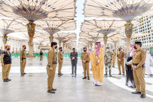 من جهته، أعرب مدير شرطة منطقة المدينة المنورة اللواء عبدالرحمن المشحن، عن شكره لسمو الأمير فيصل بن سلمان على دعمه ومتابعة سموه المستمرة للأعمال والخدمات الشرَطيّة بالمنطقة لاسيما قوة أمن المسجد النبوي الشريف، مشيراً إلى أنه تم في بداية شهر ربيع الأول من العام الحالي تعيين عدد 99 من العناصر النسائية كأول دفعة في القوة الخاصة لأمن المسجد النبوي الشريف، ويباشرن عملهن الأمني من حينه في تنظيم زيارة النساء للروضة الشريفة بمساهمة فعالة، بالإضافة إلى متابعة تطبيق الإجراءات الاحترازية والوقائية في المصلى النسائي، بعد أن حظين ببرامج تدريبية أمنية وميدانية وإدارية أهلتهن لأداء مهامهن الجديدة بمستوى عالٍ من الاحترافية.