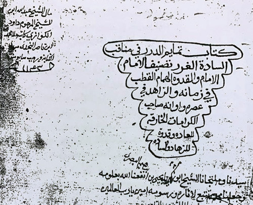 4 - (تمايم الدّرر في مناقب السّادة الغرر) ، ليحيى بن إبراهيم البصري (8)، جاء على صفحة العنوان ما نصّه: (كتاب تمايم الدرر في مناقب السادة الغرر تصنيف الإمام والقدوة الهمام القطب في زمانه والزاهد في عصره وأوانه صاحب الكرامات الخارقة للعادة وقدوة للزهاد والسادة سيدنا وملتجانا (9) الشيخ أبو زكريا يحيى بن إبراهيم البصري نفعنا الله بعلومه وجعلنا (ممن) تتبع لآثاره ورسومه آمين يا رب العالمين) (10) ، نسخه سنة 1143هـ، قال في آخره: (وقع الفراغ من كتابة هذا الكتاب الجليل ضحوة الخميس من شهر شعبان، في يوم أربعة عشر منه، على يد أفقر العباد وأحوجهم إلى رحمة ربه الكريم ملا محمد بن ناصر بن حزيم النجدي، ساكن مدرسة عبد اللطيف رحمه الله، غفر الله له ولوالديه وللمسلمين ولمن دعا له بحسن الخاتمة، سنة 1143، من الهجرة النبوية على مهاجرها أفضل الصلاة وأكمل السلام) (11) ، وعليه تملّك هذا نصّه: (مال الشيخ عبد الله ابن الشيخ المرحوم داوود الكوازي، كاتبه ملا محمد بن ناصر النجدي، مبتدا الكتابة من رجب سابع منه سنة 1143) ، [الوثيقتان 3 و4]، يقع في 168 ورقة (336 صفحة) . وقد حقّقه عبد القادر باش أعيان (12) .