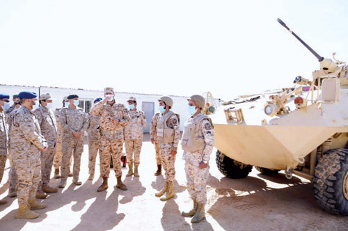 وأضاف: «افتخر بوجودي بينكم في مواقع العز والشرف»، مشيداً بالمواقف الشجاعة والبطولية في الدفاع عن دينهم وملكهم ووطنهم، والتأكيد على المعنويات العالية والمستوى المتميز الذي يتمتعون به في أداء الواجبات والمهام الموكلة لهم».