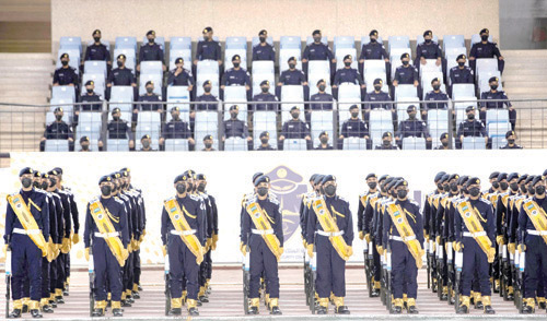 عقب ذلك ردد الخريجون قسم الولاء والطاعة بأن يكونوا مخلصين لله ثم للملك والوطن، وأن يعلو كلمة الحق ويقفوا سدًا منيعًا في وجه كل من يريد المساس بأمن الوطن وأمانه.