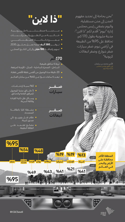 وصرّح صاحب السمو الملكي الأمير محمد بن سلمان، ولي العهد، رئيس مجلس الإدارة قائلاً: «على مدى العصور بُنيت المدن من أجل حماية الإنسان بمساحات ضيقة، وبعد الثورة الصناعية، بُنيت المدن لتضع الآلة والسيارة والمصنع قبل الإنسان. المدن التي تدعي أنها هي الأفضل في العالم، يقضي فيها الإنسان سنين من حياته من أجل التنقل، وسوف تتضاعف هذه المدة في 2050، وسوف يُهجر مليار إنسان بسبب ارتفاع انبعاثات الكربون وارتفاع منسوب مياه البحار». وتساءل سموه: «لماذا نقبل أن نضحي بالطبيعة في سبيل التنمية؟ ولماذا يتوفى 7 ملايين إنسان سنويًا بسبب التلوث؟ ولماذا نفقد مليون إنسان سنوياً بسبب الحوادث المرورية؟ ولماذا نقبل أن تُهدر سنون من حياة الإنسان في التنقل؟». وتابع سموه: «نحن بحاجة إلى تجديد مفهوم المدن إلى مدن مستقبلية، اليوم بصفتي رئيس مجلس إدارة نيوم أقدم لكم «ذا لاين»؛ مدينة مليونية بطول 170 كم، تحافظ على 95c % من الطبيعة في أراضي نيوم، صفر سيارات، صفر شوارع، وصفر انبعاثات كربونية». وستعيد مدينة «ذا لاين» تعريف مفهوم التنمية الحضرية من خلال تطوير مجتمعات يكون فيها الإنسان محورها الرئيسي، وذلك للمرة الأولى منذ أكثر من 150 عاماً، مما يعزز جودة الحياة، ويضمن الوصول إلى كل مرافق الخدمات الأساسية بما في ذلك المراكز الطبية، والمدارس، ومرافق الترفيه، بالإضافة إلى المساحات الخضراء في غضون 5 دقائق سيراً على الأقدام، وستجعل حلول المواصلات الفائقة سرعة التنقل أسهل؛ إذ من المتوقع ألا تستغرق أبعد رحلة في «ذا لاين» 20 دقيقة فقط، مما سيوفر معيشة قائمة على التوازن بين بيئة أعمال حاضنة للابتكار، وجودة حياة استثنائية للسكان. وستُدار مجتمعات «ذا لاين» بالاعتماد الكامل على تقنيات الذكاء الاصطناعي لتسهيل عملية التواصل مع الإنسان بطريقة تمكنها من التوقّع والتفاعل بقدرات غير مسبوقة، مما يوفر وقت السكان والشركات. وستكون المجتمعات مترابطة افتراضياً فيما بينها، حيث سيتم تسخير نحو 90 % من البيانات لتعزيز قدرات البنية التحتية في حين يتم تسخير 1 % من البيانات في المدن الذكية الحالية. وتمنح مدينة «ذا لاين» للحياة على الأرض معنى جديداً، وتعكس نهجاً لا مثيل له في تطوير مدن مستقبلية متناغمة مع الطبيعة، حيث ستعتمد بالكامل على الطاقة النظيفة بنسبة 100 %، مع الحرص على تحقيق مستقبل إيجابي للكربون. ولبناء اقتصاد المستقبل؛ تتعاونيوم مع قيادات متخصصة من مختلف أنحاء العالم، على توفير حلول ناجعة لتحديات التوسع الحضري التي تعترض تقدم البشرية، وستكون «ذا لاين» بيئة جاذبة للمبدعين وروّاد الأعمال والمستثمرين.