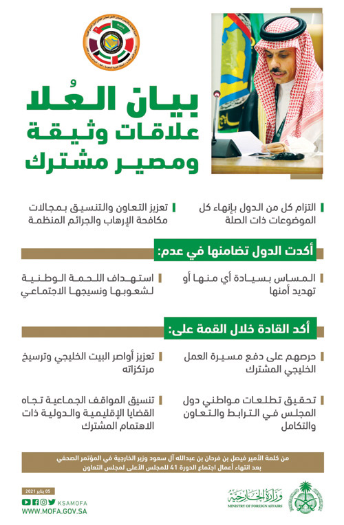 وعن قمة العلا تحدث صاحب السمو الأمير فيصل بن فرحان بن عبد الله وزير الخارجية مؤكداً أن اجتماع الدورة الحادية والأربعين للمجلس الأعلى لمجلس التعاون لدول الخليج العربية التي رأسها نيابة عن خادم الحرمين الشريفين الملك سلمان بن عبد العزيز آل سعود -حفظه الله-، صاحب السمو الملكي الأمير محمد بن سلمان بن عبد العزيز ولي العهد نائب رئيس مجلس الوزراء وزير الدفاع، اكتسبت أهمية بالغة لكونها أعلت المصالح العليا لمنظومة مجلس التعاون الخليجي والأمن القومي العربي، لترسل رسالة إلى العالم أجمع أنه مهما بلغت الخلافات في البيت الواحد إلا أن حكمة قادة دول المجلس قادرة - بعد مشيئة الله تعالى - على تجاوز كل ذلك، والعبور بالمنطقة ودولها وشعوبها إلى بر الأمان.