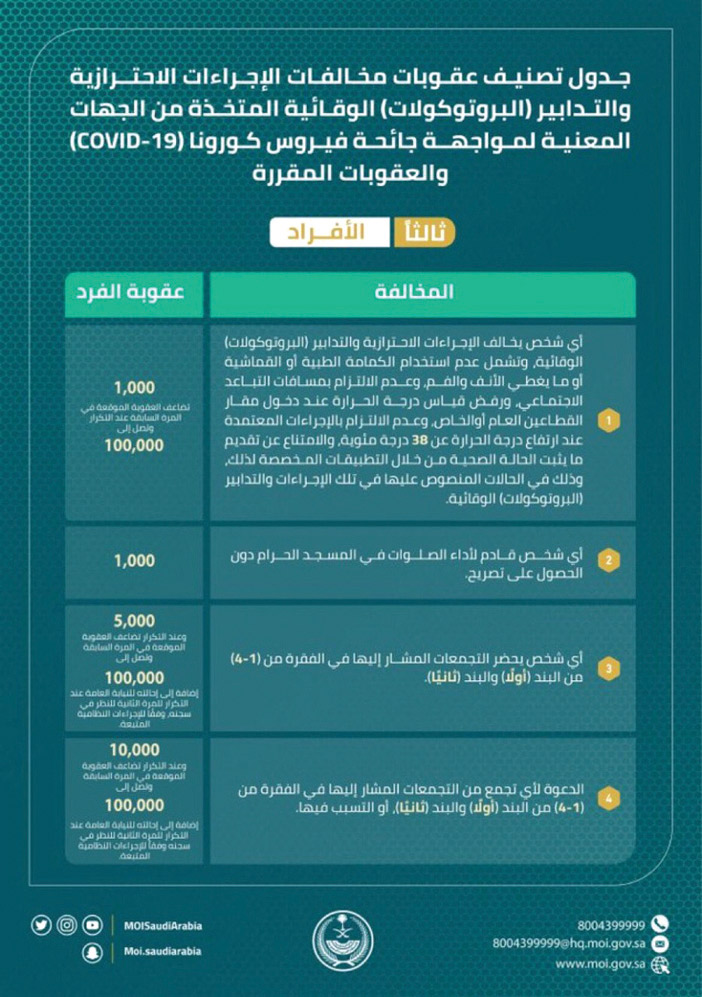 1- (1000) ريال، وتضاعف العقوبة الموقعة في المرة السابقة عند التكرار وتصل إلى (100.000) ريال لأي شخص يخالف الإجراءات الاحترازية والتدابير (البروتوكولات) الوقائية بـ (عدم استخدام الكمامة الطبية أو القماشية أو ما يغطي الأنف والفم، عدم الالتزام بمسافات التباعد الاجتماعي، رفض قياس درجة الحرارة عند دخول مقار القطاعين العام أو الخاص، عدم الالتزام بالإجراءات المعتمدة عند ارتفاع درجة الحرارة عن 38 درجة مئوية، الامتناع عن تقديم ما يثبت الحالة الصحية من خلال التطبيقات المخصصة لذلك، وذلك في الحالات المنصوص عليها في تلك الإجراءات والتدابير (البروتوكولات) الوقائية.