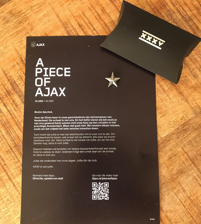 وبحسب الموقع الرسمي للنادي على شبكة الإنترنت فإن الفكرة هي تكوين نجوم صغيرة من قصدير الدرع وإرسالها إلى المنتسبين إلى النادي. وتم تحويل الدرع التي تزن 2,75 كلغ من القصدير إلى 42 ألف نجمة بوزن 3,45 غرام، تم إرسالها بالبريد مع رسالة «قطعة من التاريخ، قطعة من أياكس. من أجلكم».