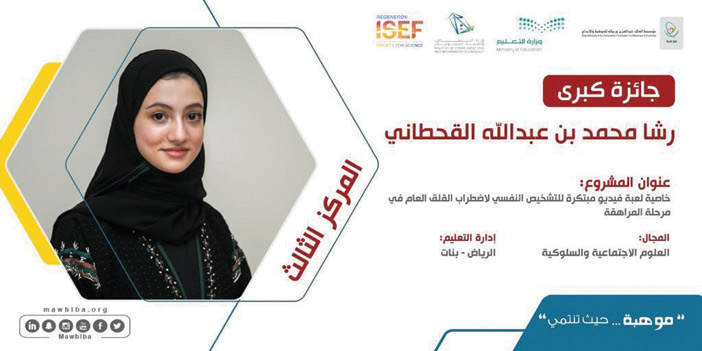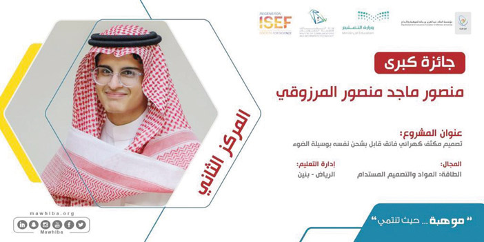 وحقق الجوائز الكبرى كل من: الطالب منصور المرزوقي بفوزه بالمركز الثاني في مجال الطاقة: المواد والتصميم المستدام عن مشروعه «تصميم مكثف كهربائي فائق يشحن نفسه بوسيلة الضوء»، وجاءت الطالبة رشا القحطاني في المركز الثالث في مجال العلوم الاجتماعية والسلوكية عن مشروعها «خاصية لعبة فيديو مبتكرة للتشخيص النفسي لاضطراب القلق العام في مرحلة المراهقة»، والطالبة لانا أبو جامل حققت المركز الرابع في مجال علم الأحياء الحسابي والمعلوماتي عن مشروعها «التنبؤ الحاسوبي لقابلية استخدام مركب خاص كمثبط لفيروس SARS-CoV-2 بأقل أضرار جانبية»، والطالب عبدالله الشنقيطي بجائزة المركز الرابع في مجال الطاقة: المواد والتصميم المستدام عن مشروعه «قطب كهربائي من النيكل كوبالتايت لإنتاج وقود الهيدروجين بسعر منخفض وطريقة متجددة»، والطالبة أروى نيازي بجائزة المركز الرابع في مجال علم المواد عن مشروعها تصنيع مكثف فائق يستجيب للشمس باستخدام نقاط الكربون الكمية.