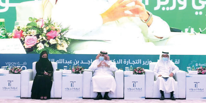 وقال: «إنني سعيد بأن ألتقيكم اليوم من تبوك الورد، أرض الأحلام، وبوابة المستقبل والعالم الجديد، حضرنا إلى منطقة تبوك بقيادات منظومة التجارة للاستماع إلى تحدياتكم ومقترحاتكم لتطوير قطاعاتكم المختلفة».