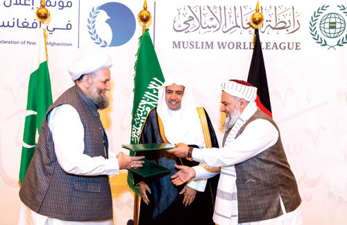 وقع كبار العلماء في جمهوريتي باكستان وأفغانستان بجوار بيت الله الحرام في مكة المكرمة، الإعلان التاريخي للسلام في أفغانستان، الذي يمهّد طريق الحل للأزمة الأفغانية التي طال أمدها، من خلال دعم المفاوضات بين الفئات المتقاتلة ونبذ كل أعمال العنف والتطرف بكل أشكالها وصورها، حيث مثلهم كل من: معالي الشيخ الدكتور نور الحق قادري وزير الشؤون الإسلامية وتسامح الأديان في جمهورية باكستان الإسلامية ومعالي الشيخ محمد قاسم حليمي وزير الحج والأوقاف والإرشاد في جمهورية أفغانستان الإسلامية. وشهد معالي الأمين العام لرابطة العالم الإسلامي رئيس هيئة علماء المسلمين معالي الشيخ الدكتور محمد بن عبدالكريم العيسى توقيع هذا الإعلان التاريخي، في ختام المؤتمر الإسلامي الذي انعقد في رحاب بيت الله العتيق بمكة المكرمة، تحت مظلة رابطة العالم الإسلامي، برعاية ودعم من المملكة العربية السعودية، وجمع للمرة الأولى كبار علماء أفغانستان وباكستان لتحقيق المصالحة بين أبناء الشعب الأفغاني. وشهد الإعلان التاريخي الاتفاق على إيجاد حلٍ نهائي وشامل للنزاع الأفغاني، من خلال دعم عملية المصالحة بين الأطراف المتصارعة في أفغانستان، والوصول بها إلى أرضية مشتركة من الوفاق، بتناول كل القضايا السياسية والاجتماعية والاقتصادية وغيرها من القضايا ذات الصلة، من خلال روح العمل المشترك؛ ليتسنى وقف إراقة الدماء المستمرة في أفغانستان، وقيادة الشعب الأفغاني لطريق السلام والمصالحة والاستقرار والتقدم في هذا العالم بعون الله، إضافة إلى التأكيد على عدم ربط العنف بأي دين أو جنسية أوحضارة أو عرق، وعدّ العنف الناتج عن التطرف والإرهاب بكل أشكاله وصوره -بما فيه من عنفٍ ضد المدنيين وهجماتٍ انتحارية- مناقضاً لمبادئ العقيدة الإسلامية الأساسية. وتقدم علماء باكستان وأفغانستان إلى مقام خادم الحرمين الشريفين الملك سلمان بن عبدالعزيز آل سعود وسمو ولي عهده الأمين صاحب السمو الملكي الأمير محمد بن سلمان آل سعود -حفظهما الله- بالشكر والتقدير، لموقف المملكة الثابت والتاريخي تجاه دعم السلام والاستقرار في أفغانستان، منوهين بجهود المملكة العربية السعودية الصادقة بمد الجسور وتوحيد الصف، التي تكللت بجمع علماء الجانبين على منبر واحد. كما شددوا على أهمية المملكة في بناء التضامن والوفاق في الأمة الإسلامية، مؤكدين تطلعهم إلى دعمها المستمر للمحافظة على الزخم الذيولّده هذا الإعلان في أوساط العلماء في العالم الإسلامي عموماً، وفي أوساط العلماء في باكستان وأفغانستان خصوصاً.