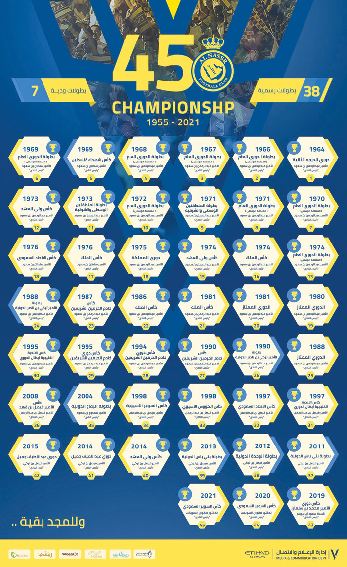 وحل ثانياً، فريق الاتحاد بعدد بطولاته الرسمية الـ35، بينما مجمل بطولاته الودية والرسمية وصلت 56 بطولة، وأيضاً فريق الاتحاد لم يتغير مركزه، سواء حُسبت بطولاته الرسمية فقط أو بطولاته الرسمية والودية.