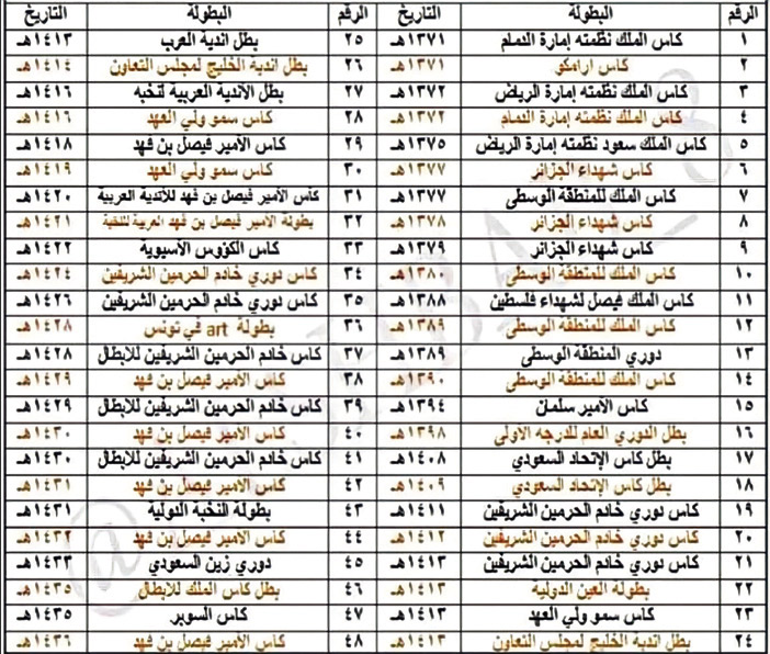 *ملاحظة: «الجزيرة» وهي تقدم هذه الإحصائية لا تعترف سوى بالبطولات الرسمية المعتبرة، ولكنها اليوم تقدم نبذة عن جميع البطولات الرسمية والودية والتي طالب البعض بتوثيقها كبطولات رسمية.