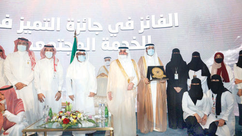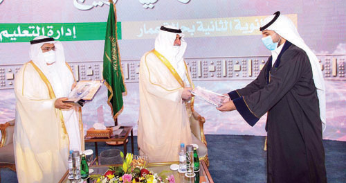 بعدها كرم سموه الفائزين والفائزات في مجال التفوق العلمي البالغ عددهم 36 فائزاً وفائزة، كما كرم الفائز في مجال التميز في الإبداع والإبتكار فني أول عبدالرحمن الحربي من مستشفى الملك سلمان للقوات المسلحة بالشمالية الغربية نظير تميزه في تطوير أسلوب الدفق النبضي للدم في أجهزة القلوب الصناعية أثناء جراحة القلب المفتوح، كما كرم سموه الشؤون الصحية بمنطقة تبوك في مجال مسار الخدمة المجتمعية، نظير ما قدموا من جهود في التصدي لجائحة كورونا، وحماية المجتمع من خطرها.