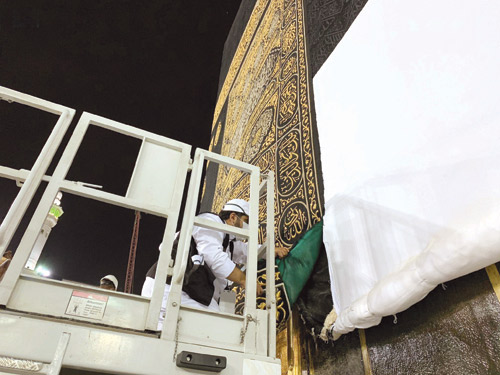من جانبه بيَّن وكيل الرئيس العام لشؤون المسجد الحرام الدكتور سعد بن محمد المحيميد أنه سيتم يوم الاثنين القادم التاسع من شهر ذي الحجة إنزال الكسوة القديمة للكعبة، وإلباسها الكسوة الجديدة، والمكونة من أربعة جوانب مفرقة وستارة الباب، حيث يتم رفع كل جنب من جوانب الكعبة الأربع على حدة، إلى أعلى الكعبة المشرفة تمهيداً لفردها على الجنب القديم ويتم تثبيت الجنب من أعلى بربطها وإسقاط الطرف الآخر من الجنب بعد أن يتم حلّ حبال الجنب القديم، بتحريك الجنب الجديد إلى أعلى وأسفل في حركة دائمة، بعدها يسقط الجنب القديم من أسفل ويبقي الجنب الجديد، وتتكرر العملية أربع مرات لكل جانب إلى أن يكتمل الثوب، وبعدها يتم وزن الحزام على خط مستقيم للجهات الأربع بخياطته، وتبدأ هذه العملية أولاً من جهة الحطيم، لوجود الميزاب الذي له فتحة خاصة به بأعلى الثوب، وبعد أن يتم تثبيت كل الجوانب تثبت الأركان بحياكتها من أعلى الثوب إلى أسفله، وبعد الانتهاء من ذلك يتم وضع الستارة التي تحتاج إلى وقت وإتقان في العمل، بعمل فتحة تقدر بمساحة الستارة في القماش الأسود التي تقدر بحوالي 3.30 أمتار عرضاً حتى نهاية الثوب، ومن ثم يتم عمل ثلاث فتحات في القماش الأسود لتثبيت الستارة من تحت القماش، وأخيراً يتم تثبيت الأطراف بحياكتها في القماش الأسود على الثوب. وأشار وكيل الرئيس العام لشؤون المسجد الحرام إلى أنه يعمل في مجمع الملك عبد العزيز لكسوة الكعبة المشرفة قرابة 200 صانع وإداري، مبيناً أن أقسام المجمع هي قسم المصبغة والنسيج الآلي، وقسم النسيج اليدوي، وقسم الطباعة، وقسم الحزام وقسم المذهبات، وقسم خياطة وتجميع الكسوة الذي يضم أكبر ماكينة خياطة في العالم من ناحية الطول حيث يبلغ طولها 16 متراً وتعمل بنظام الحاسب الآلي، مبيناً أن هناك بعض الأقسام المساندة مثل المختبر والخدمات الإدارية والجودة والعلاقات العامة والصحية للعاملين والسلامة المهنية بالمجمع، لافتاً النظر إلى أن الكسوة تستهلك نحو 670 كيلو جراماً من الحرير الخام الذي تتم صباغته داخل المجمع باللون الأسود و120 كيلو جراماً من أسلاك الذهب و100 من أسلاك الفضة. وأوضح أن الكسوة تتوشح من الخارج بنقوش منسوجة بخيوط النسيج السوداء (بطريقة الجاكارد) كتب عليها لفظ «يا الله يا الله»، «لا إله إلا الله محمد رسول الله» و»سبحان الله وبحمده» و»سبحان الله العظيم» و»يا ديان يا منان»، وتترر هذه العبارات على قطع قماش الكسوة جميعها، مشيراً إلى أن عدد قطع حزام كسوة الكعبة المشرفة 16 قطعة، و6 قطع و12 قنديلاً أسفل الحزام و4 صمديات توضع في أركان الكعبة، و5 قناديل «الله أكبر» أعلى الحجر الأسود، إضافة إلى الستارة الخارجية لباب الكعبة المشرفة.