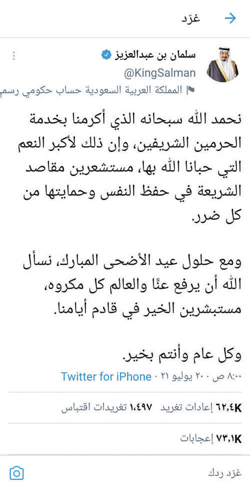 وجه خادم الحرمين الشريفين الملك سلمان بن عبدالعزيز آل سعود - حفظه الله -، كلمة لحجاج بيت الله الحرام والمُرابطين والمرابطات في مواجهة المخاطر، والأزمات والمواطنين والمقيمين وعموم المسلمين في كل مكان، بمناسبة عيد الأضحى المبارك، فيما يلي نصها: