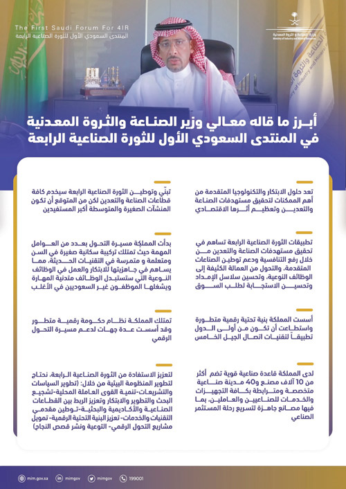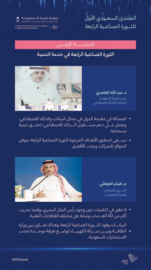 يذكر أن المنتدى السعودي الأول للثورة الصناعية الرابعة يستكمل أعماله غداً بعقد أربع جلسات تناقش تحولات الطاقة النظيفة، وبناء مدن ذكية للمستقبل، واستعادة النظام البيئي، ومستقبل التمويل.