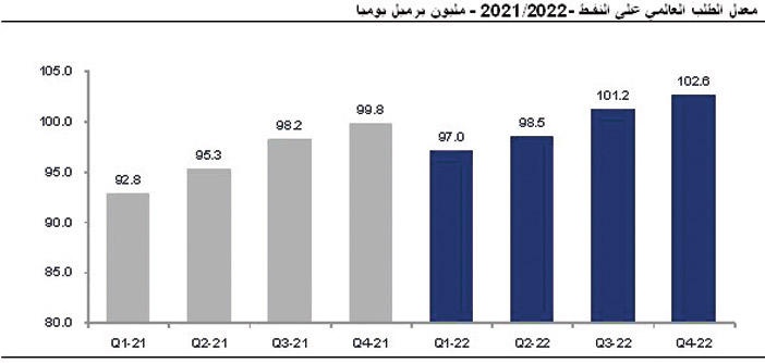 وعلى صعيد الطلب، أشارت البيانات الشهرية الصادرة عن وكالة الطاقة الدولية إلى أن الطلب على النفط ارتفع بمقدار 3.2 مليون برميل يومياً في يونيو 2021 إلى 96.8 مليون برميل يومياً، أي أقل بنسبة 3 في المائة عن مستويات ما قبل الجائحة. وتتوقع وكالة الطاقة الدولية أن يرتفع الطلب أكثر خلال الربع الثالث من العام 2021 بفضل اتساع نطاق برامج اللقاحات في الدول المتقدمة. وتتوقع الوكالة ارتفاع الطلب بمقدار 3.3 مليون برميل يومياً على أساس ربع سنوي خلال الربع الثالث من العام 2021، أي أعلى بواقع مرتين إلى ثلاث مرات عن الزيادة الموسمية العادية للطلب خلال الربع الثالث. أما بالنسبة للعام بأكمله، تتوقع الوكالة أن يرتفع الطلب على النفط بمقدار 5.3 مليون برميل يومياً ليصل إلى 96.4 مليون برميل يومياً في العام 2021 ثم إلى 99.5 مليون برميل يومياً في العام 2022. من جهة أخرى، أعلنت الأوبك عن توقعاتها الأولية لسوق النفط للعام 2022. وتتوقع الوكالة أن ينمو الطلب على النفط بمقدار 3.3 مليون برميل يومياً وأن يصل في المتوسط إلى 99.86 مليون برميل يومياً في العام 2022، مع توقع الوصول إلى مستوى 100 مليون برميل يومياً بحلول النصف الثاني من العام 2022. ومن المتوقع أن ينمو طلب الدول التابعة لمنظمة التعاون الاقتصادي والتنمية بمقدار 1.5 مليون برميل يومياً العام المقبل، بينما من المتوقع أن ينمو طلب الدول غير التابعة للمنظمة بمقدار 1.8 مليون برميل يومياً.