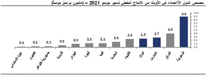 وعلى صعيد العرض، أدى تقييد الإنتاج في الولايات المتحدة إلى وصول فروق أسعار خام غرب تكساس الوسيط ومزيج خام برنت إلى أعلى المستويات منذ أكتوبر 2020. ووفقاً للتقارير، أدت زيادة معدلات الطلب إلى تراجع مخزونات مركز كوشينغ إلى أدنى مستوياتها المسجلة منذ مارس 2020. وانخفض مخزون النفط الخام في الولايات المتحدة على مدار ثمانية أسابيع متتالية، إلا أنه ارتفع الأسبوع الماضي بمقدار 2.1 مليون برميل يومياً. وتراجع إجمالي المخزون بمقدار 62.1 مليون برميل منذ أبريل 2021 على الرغم من الزيادة المطردة في الإنتاج منذ مايو 2021 ليصل إلى 11.4 مليون برميل يومياً خلال الأسبوع المنتهي في 16 يوليو 2021. كما أعلن منتجو الأوبك عن زيادة واسعة النطاق بإضافة 0.6 مليون برميل يومياً على أساس شهري في يوليو 2021.