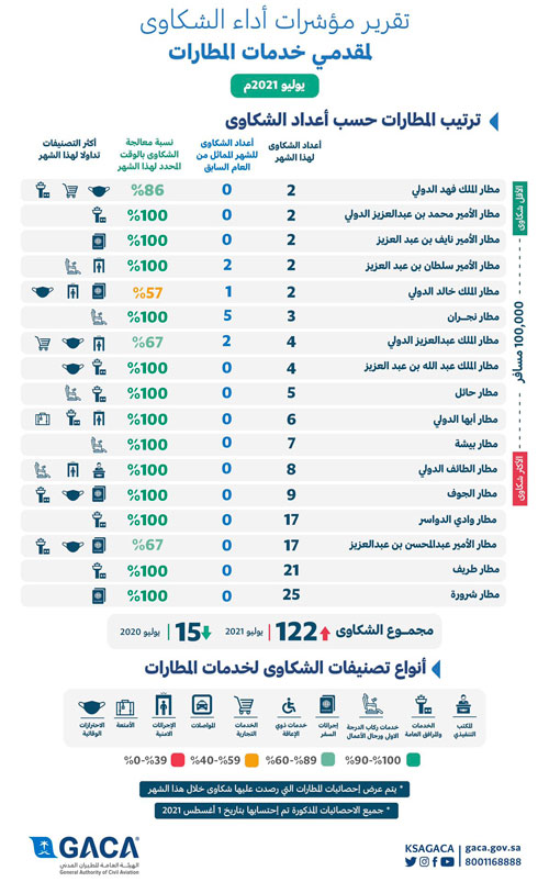 أصدرت الهيئة العامة للطيران المدني أمس، مؤشر تصنيف مقدمي خدمات النقل الجوي والمطارات من واقع عدد الشكاوى المرفوعة من المسافرين للهيئة خلال شهر يوليو 202م.