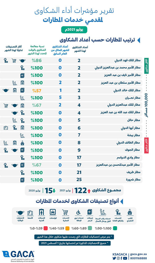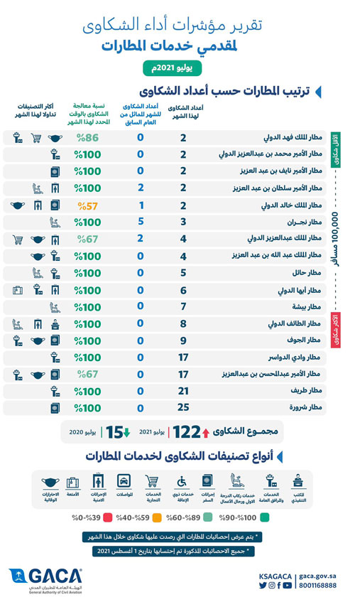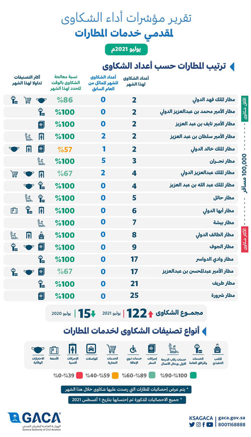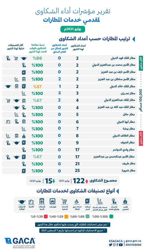 وأوضحت الهيئة أن مؤشر تصنيف مقدمي خدمات المطارات، أشار إلى حصول مطار الملك فهد الدولي بالدمام كأقل المطارات من حيث الشكاوى المرفوعة للهيئة لكل 100 ألف مسافر في المؤشر خلال شهر يوليو الماضي وذلك بواقع شكوتين وبنسبة معالجة للشكوى بالوقت المحدد وصلت إلى 86 %، بينما حلّ ثانيًا مطار الأمير محمد بن عبدالعزيز الدولي بالمدينة المنورة بشكوتين لكل 100 ألف مسافر قُدمت على المطار وتم إغلاقها بنسبة 100 %، فيما جاء ثالثاً مطار الأمير نايف بن عبدالعزيز الدولي بالقصيم بشكوتين لكل 100 ألف مسافر وبنسبة معالجة للشكوى بالوقت المحدد وصلت إلى 100 %، وحلت المطارات التالية على التوالي كأقل المطارات شكاوى لكل 100 ألف مسافر وهي (مطار الأمير سلطان بن عبدالعزيز الدولي بتبوك، مطار الملك خالد الدولي بالرياض، مطار نجران، مطار الملك عبدالعزيز الدولي بجدة، مطار الملك عبدالله بن عبدالعزيز الدولي بجازان، مطار حائل الدولي، مطار أبها الدولي، مطار بيشة، مطار الطائف الدولي، مطار الجوف الدولي، مطار وادي الدواسر، مطار الأمير عبدالمحسن بن عبدالعزيز الدولي بينبع، مطار طريف، مطار شروره).